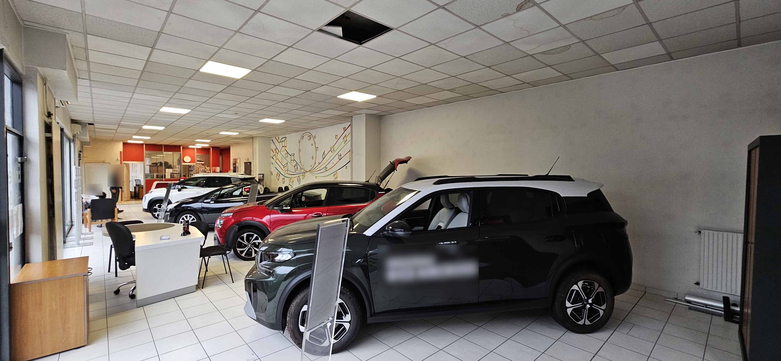 Accueil clientèle, bureaux, hall d’exposition (5 véhicules), atelier de mécanique rapide