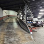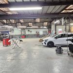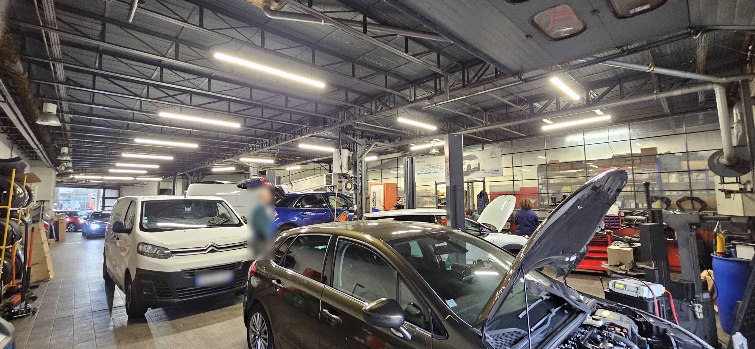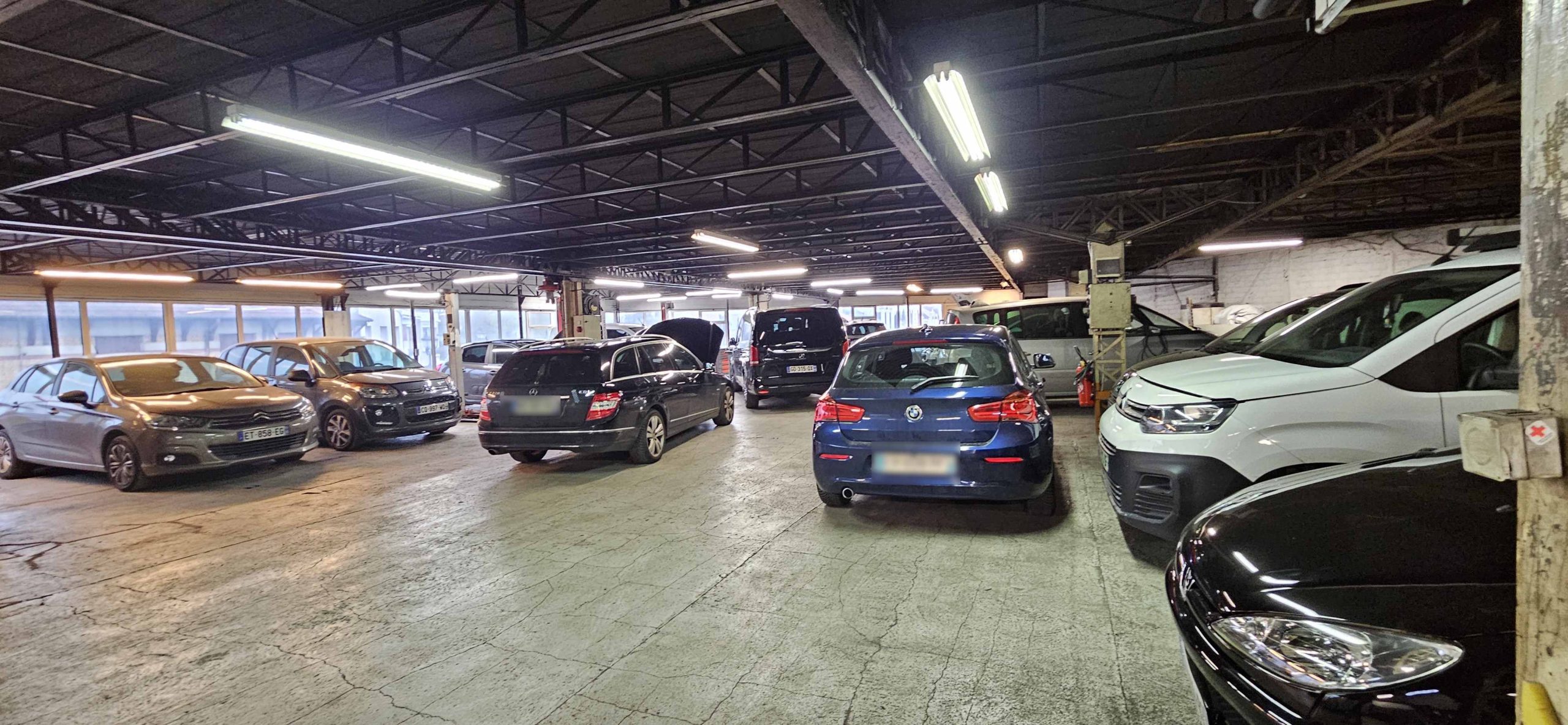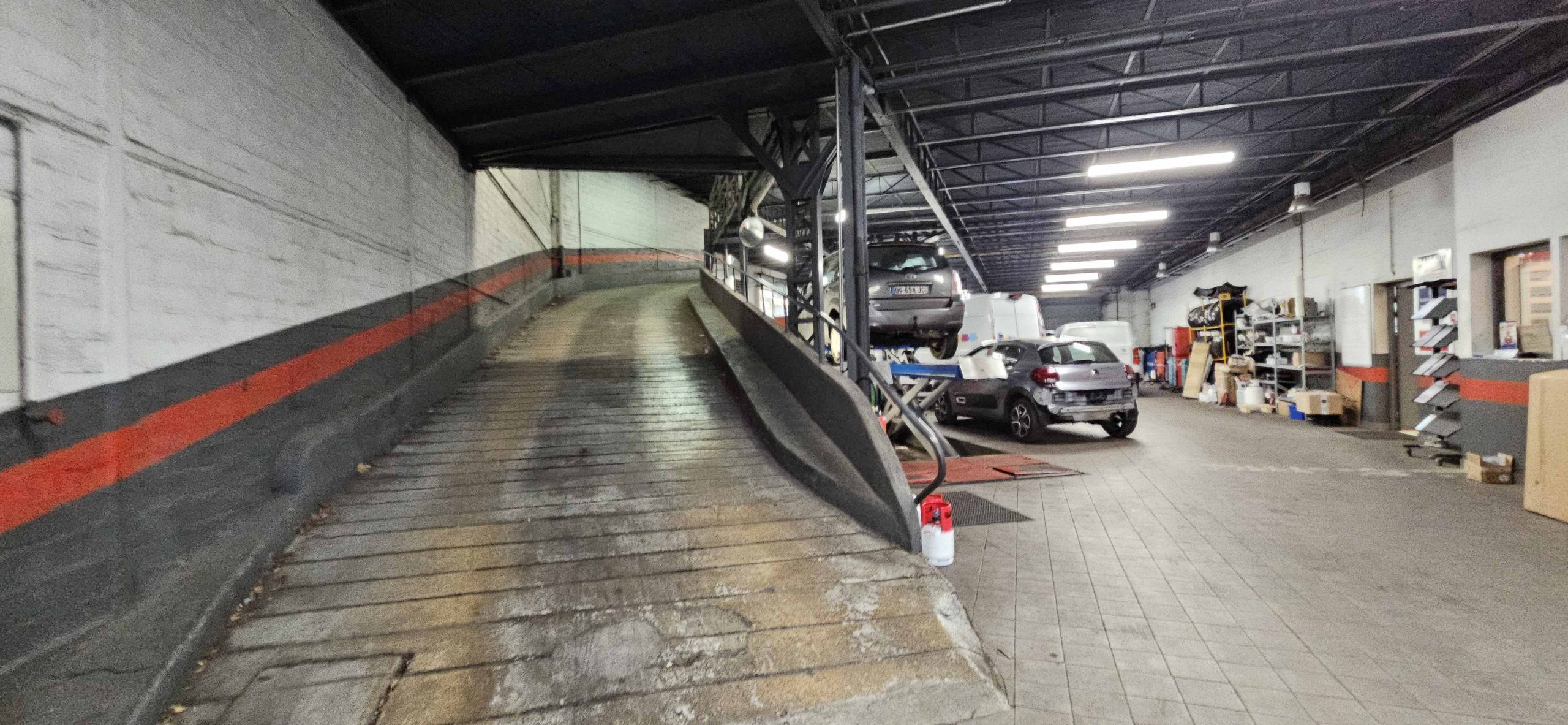Atelier de grosse mécanique, préparation de véhicules, zone de stockage